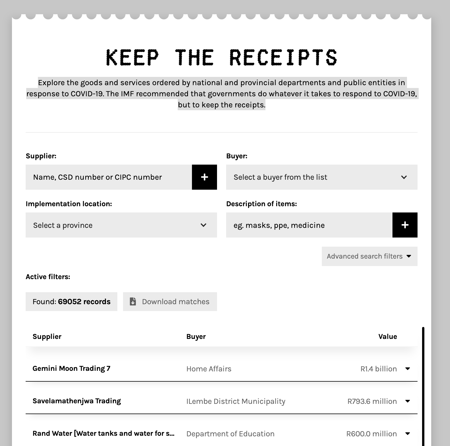 Explore the goods and services ordered by national and provincial departments and public entities in response to COVID-19. The IMF recommended that governments do whatever it takes to respond to COVID-19, but to keep the receipts.