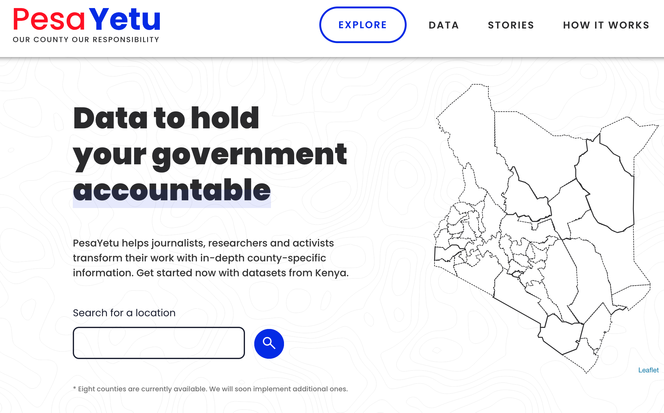 Budgets & FinancePesaYetu, an easy-to-use visualisation tool that helps journalists quickly find, analyse and compare government budget data to help fact-check claims about resource allocations, public procurement and development plans or services.